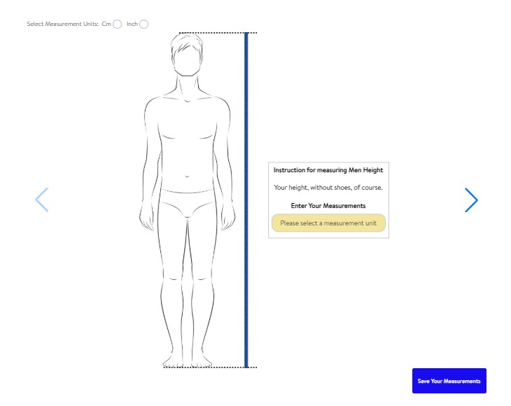 The most comprehensive option for customers who want a truly bespoke fit. A step-by-step wizard guides the customer through each body measurement in sequence. Each step displays an illustrated body diagram with the relevant measurement visually highlighted, alongside plain-language instructions explaining exactly how to take that measurement at home — no tailor required.