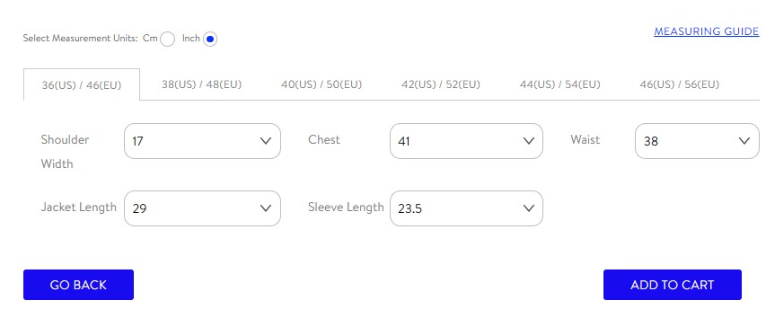 arment at home, they can measure it directly and enter those values — the measuring guide is one click away inline. Bodies don’t conform to size charts, and this flow accounts for that reality.
