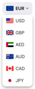 Multi-currency system covering EUR, USD, GBP, AED, AUD, CAD, and JPY — auto-detecting visitor location and displaying the correct currency at every touchpoint.