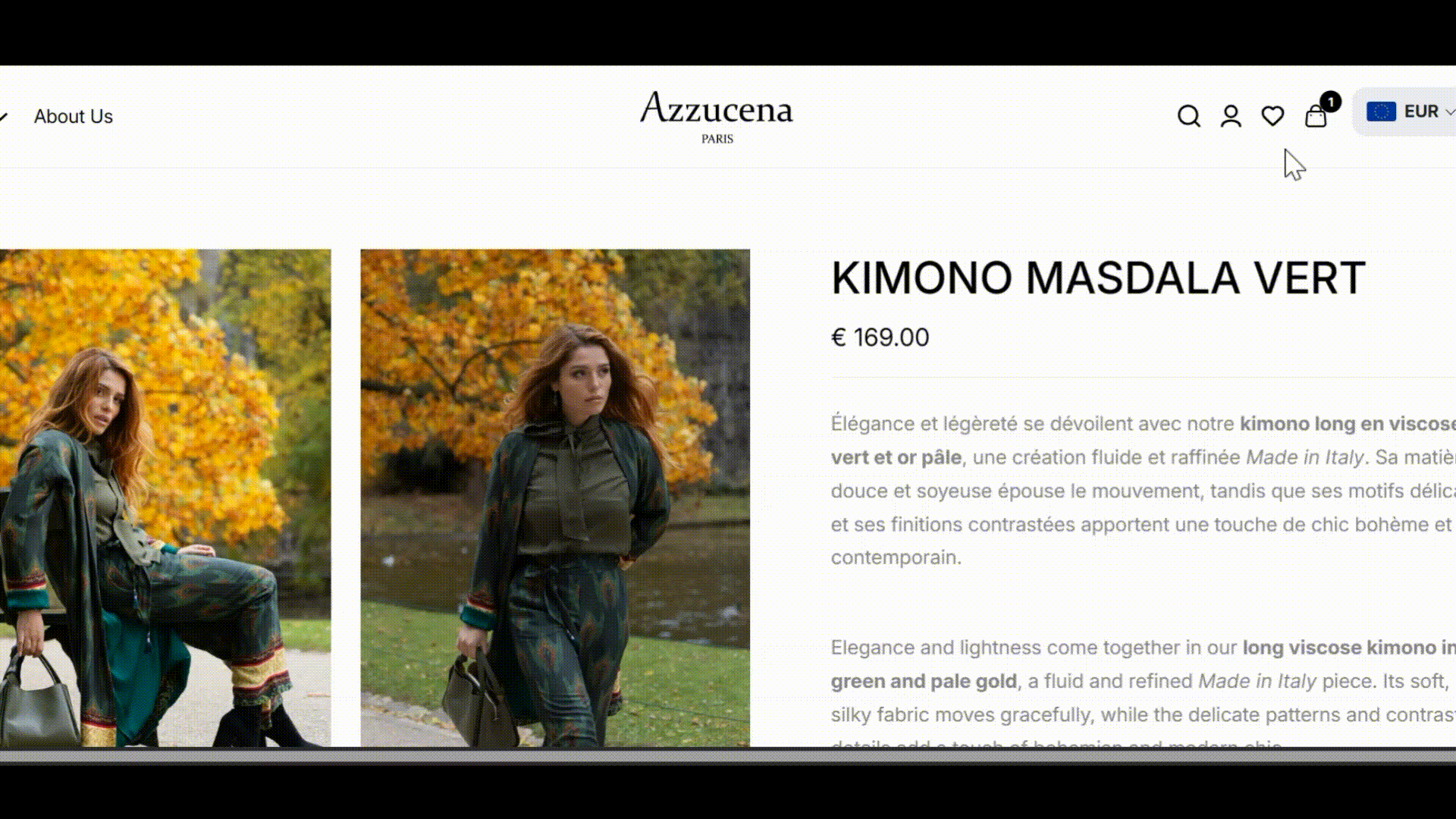 Azzucena’s target market was never just France. The brand’s aesthetic — Parisian-inspired kimonos and crystal jewellery — has natural appeal to buyers in the UK, UAE, US, Australia, Canada, and Japan. Building a store that could only sell in euros would have locked them out of most of that opportunity.